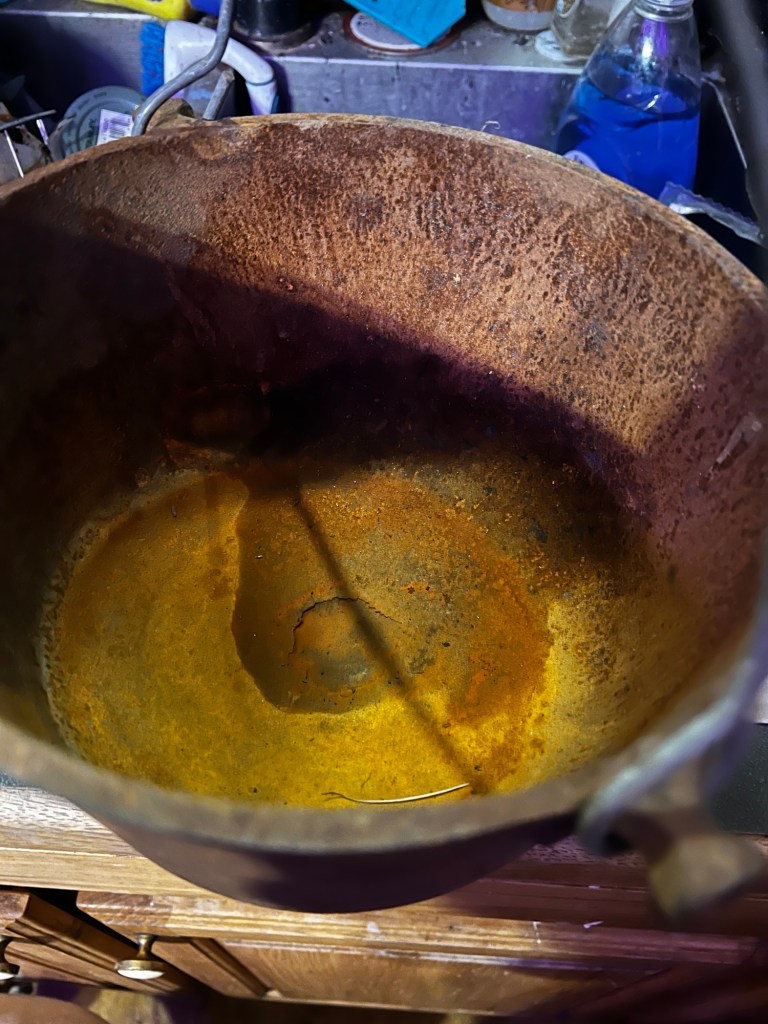 After SEVERAL iterations in and out of the vinegar, it looked like I could start on drying it really well and starting to season it. I know you’re SUPPOSED to do that in the oven but when the oven doesn’t actually work, you do it how you do it. SO, stove top it was.