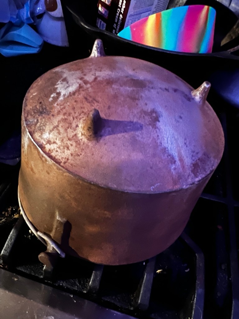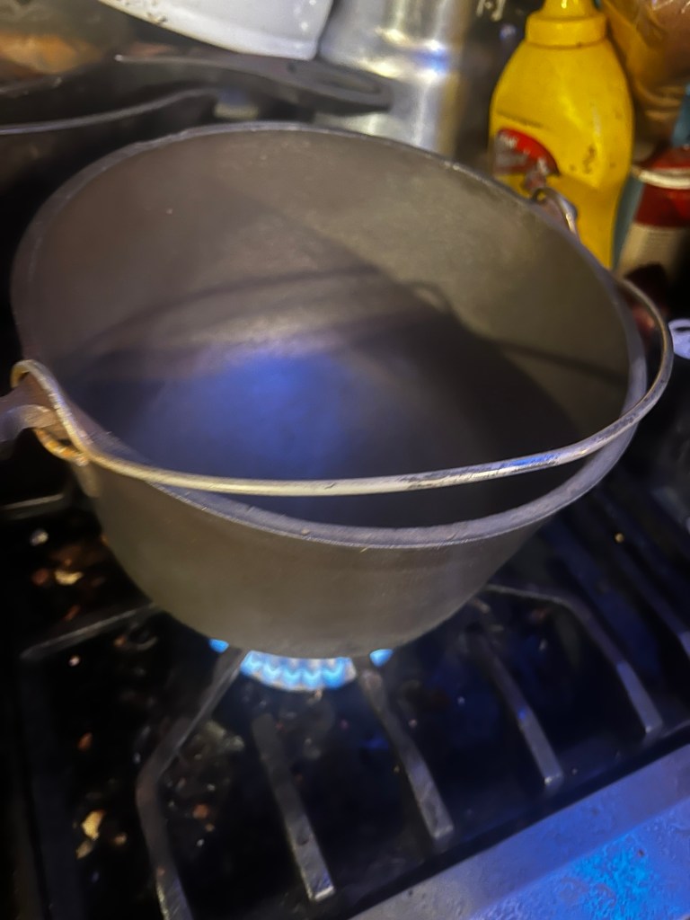 This week, I took the bait and bought one. Did have to drive a ways but I’m convinced it was worth it! I bought an 8 inch pot with wire handle. I don’t know the age (I will get around to researching that) but it looked loved and like it had a story.