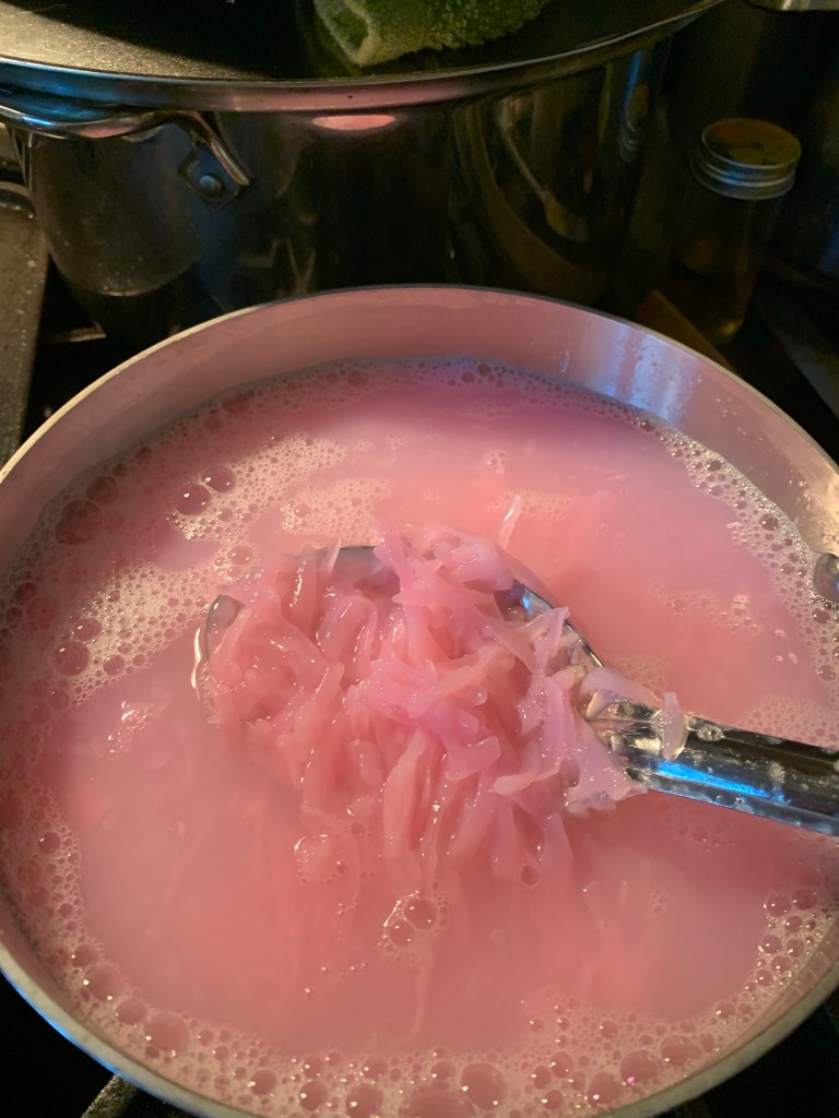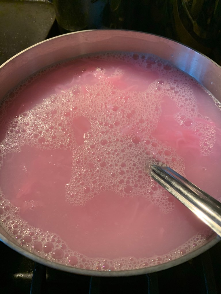 Put grated soap in a pan with a half gallon of water and heat. Heat is slowly and stir pretty much constantly until everything is dissolved. I read that it takes about 10 min. I stood with a cup of coffee stirring it and it probably took at least 10 maybe closer 15 or so. If I had smaller ribbons off of the grater, it probably would have dissolved quicker.