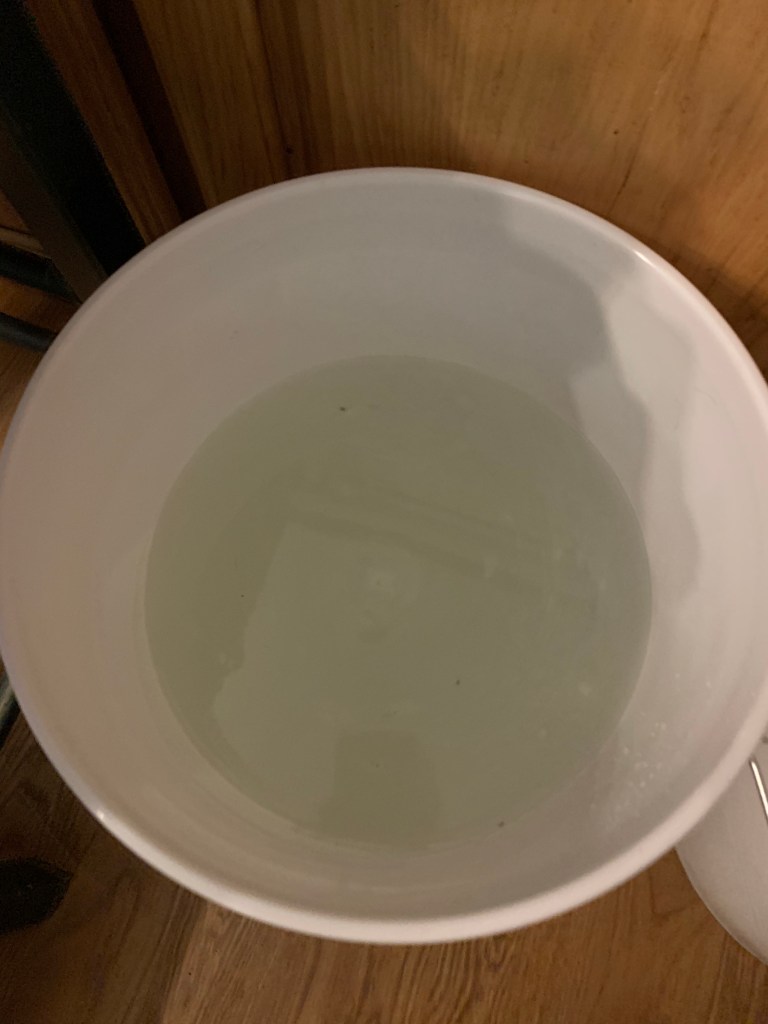 Half fill the 5 gallon bucket with hot water and dissolve the borax and laundry soda in it. It’s caustic so if your skin is in any way sensitive you might want to wear gloves while you do this part. I didn’t and my hands are none the worse for wear.